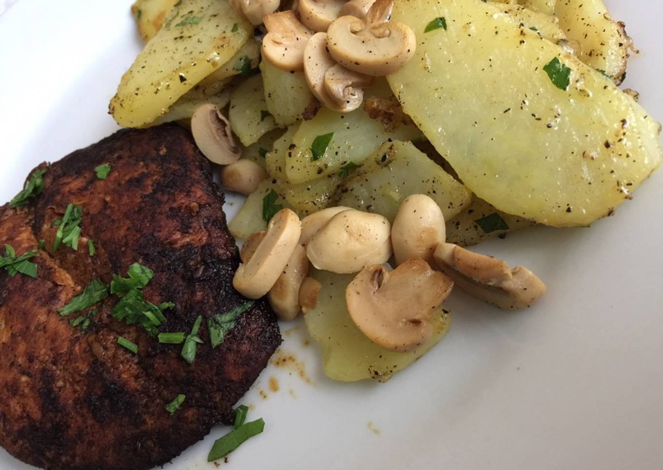Pechuga a la plancha, acompañadas de papas salteadas y champiñones🤤