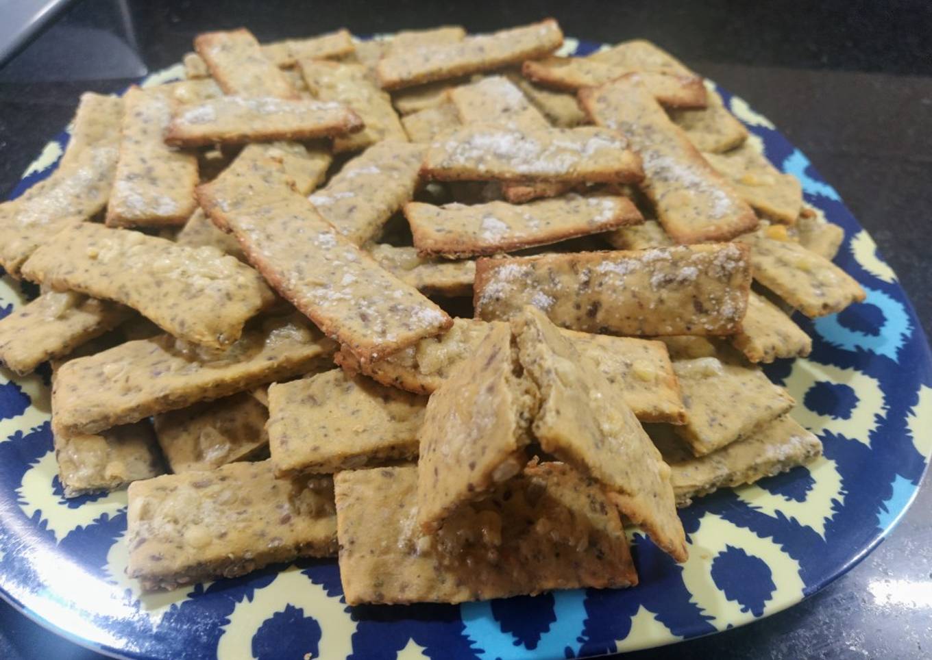- En un bowl mezclar la harina, las semillas, condimentos, el queso crema o aceite y el agua, formando una masa tierna que se pueda amasar. Amasar incorporando un poco más de harina de garbanzos o de fainá. Dejar reposar unos minutos, estirar sobre la mesada enharinada y cortar las galletitas, de la medida que quieras.