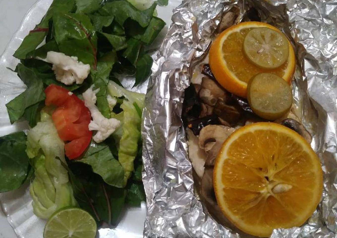 Pechuga empapelada con chile de árbol, champiñón, naranja y limón