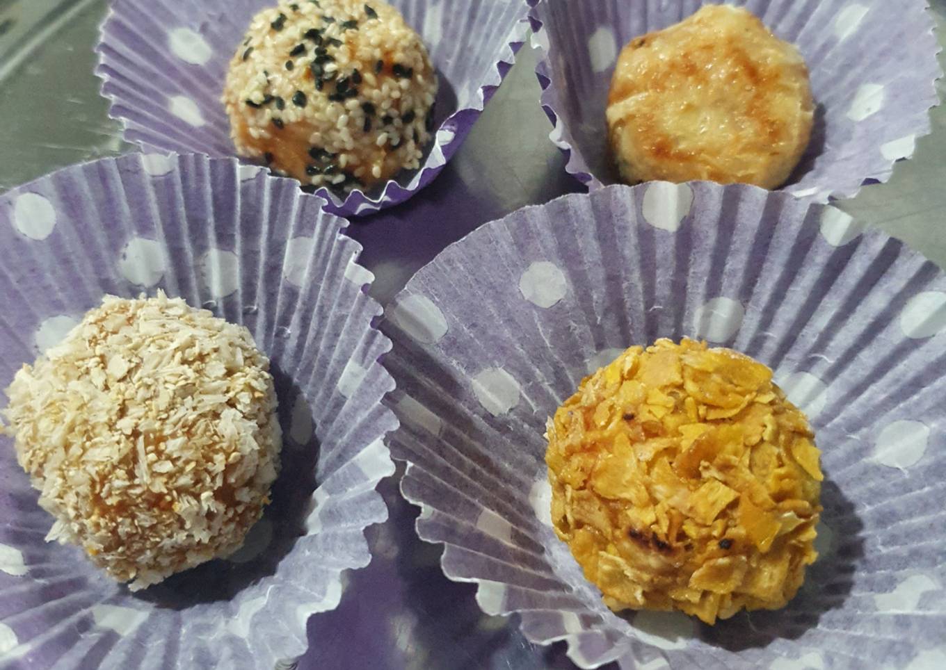 - Armar bolitas peque帽as y pasarlas por harina, huevo y el rebozado que elijamos, algunas las podemos rellenar con unos cubitos de queso para derretir, haciendo un huequito y volviendo a darle forma de bolitas para que quede cerrado.
