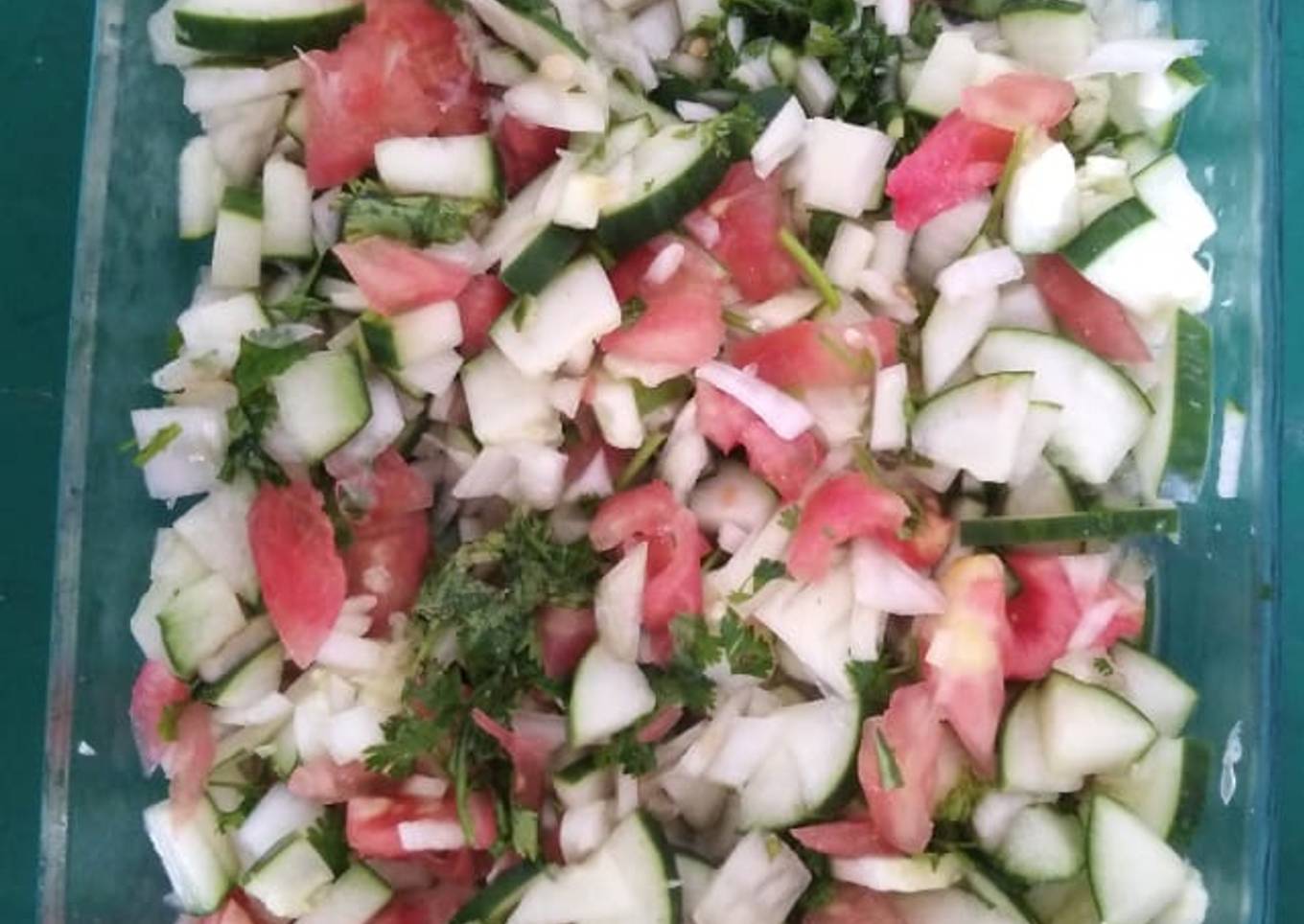 - 1 pepino, 1 cebolla cabezona, 2 tomates, 20 gramos de perejil