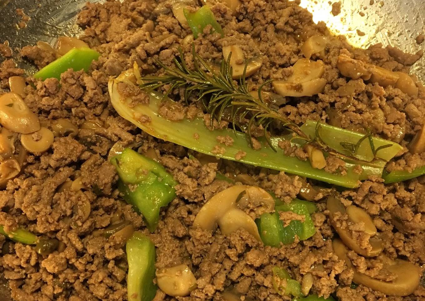 - A temperatura media-baja calentar 2 cdas de aceite de oliva y verter la carne(esta era congelada así que si va cociendo con el líquido que va botando al descongelarse), la ramita de romero. Saltear y cuando pierda el color rosado, ir agregando los sazones, el vino y champiñones continuar moviendo por 10 minutos.