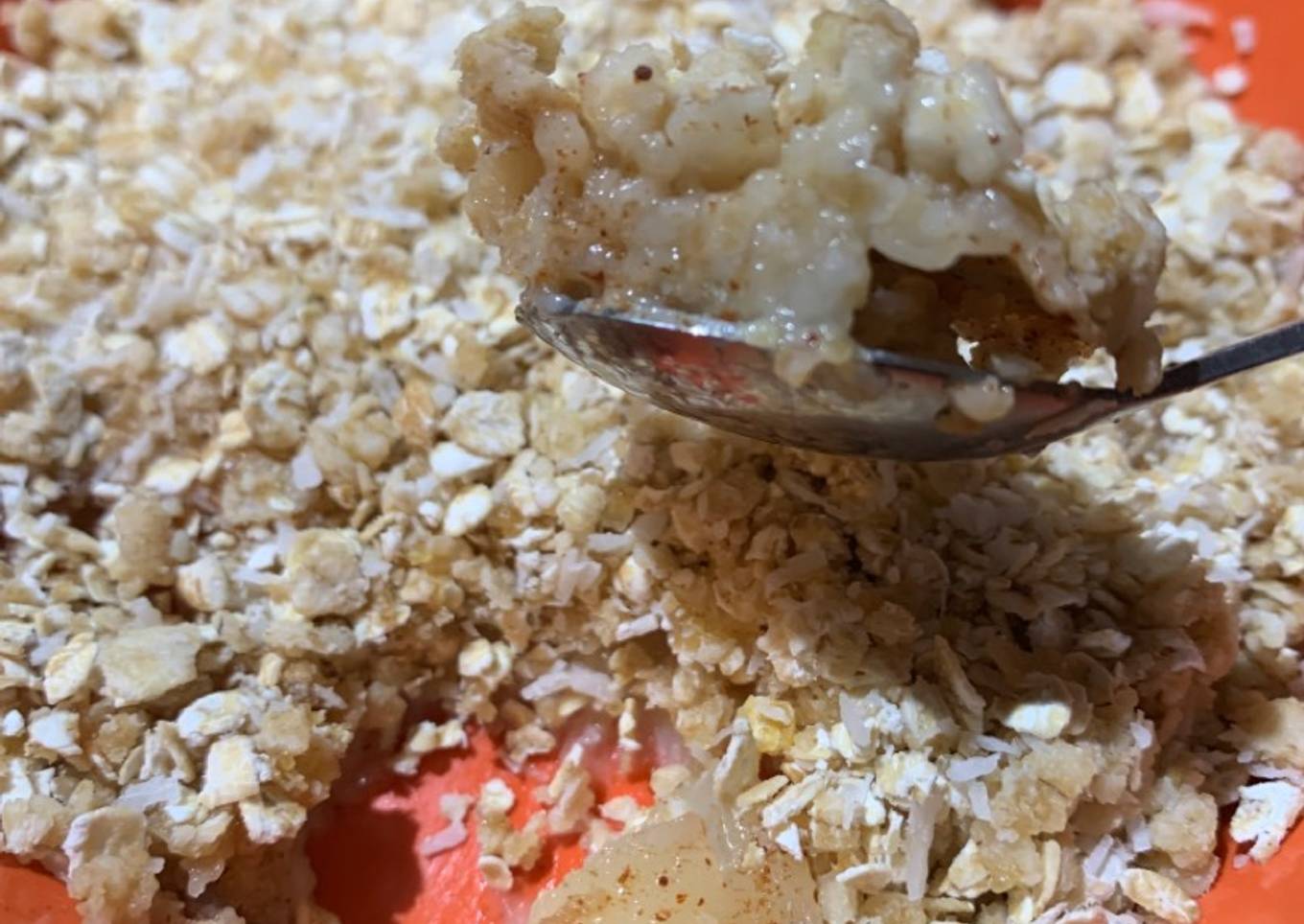- En otro recipiente colocamos la avena laminada, la harina, coco, azúcar y aceite. Mezclamos y colocamos por encima de las peras. Llevar a microondas durante 3 minutos y listo!