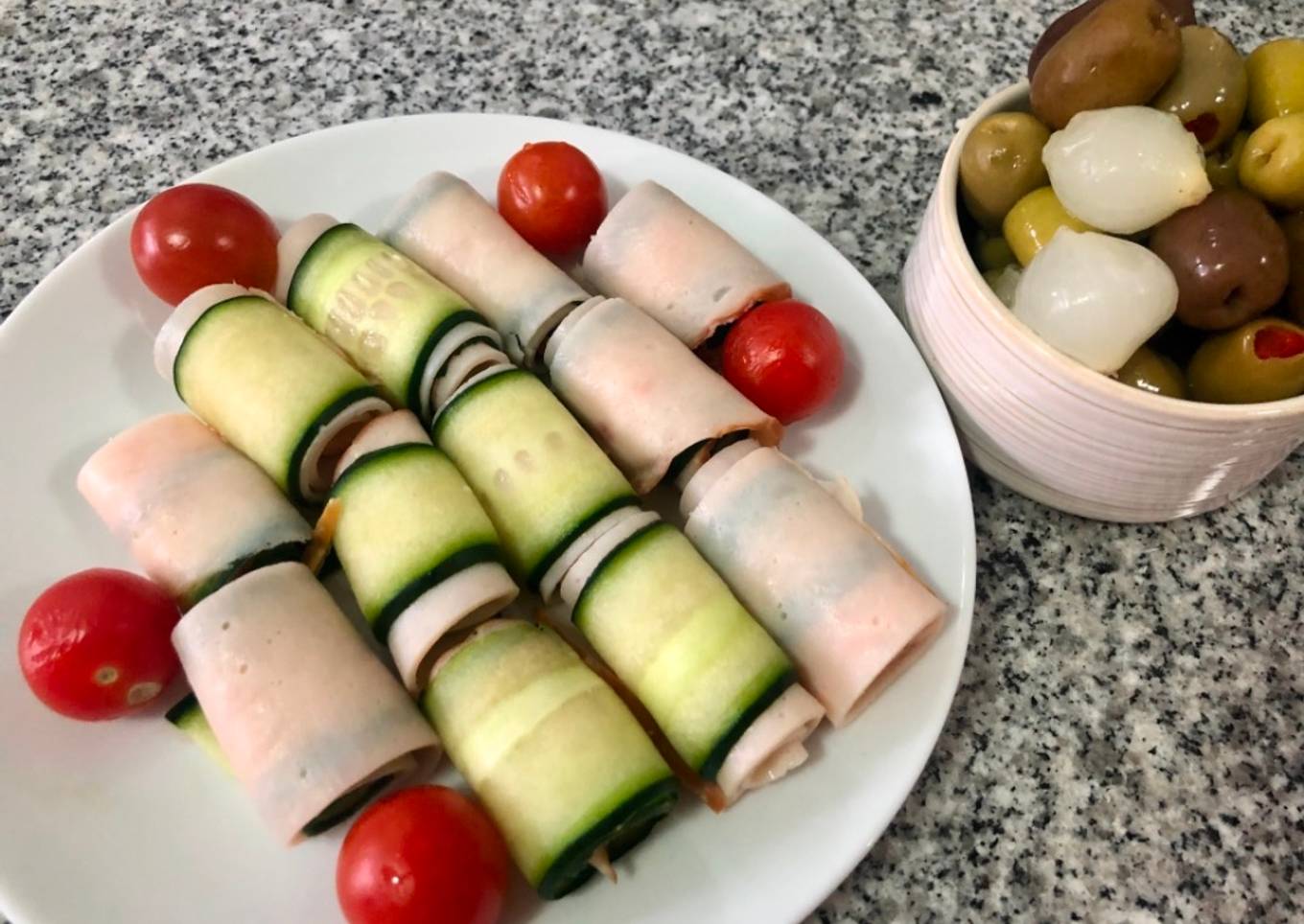 - Enrollar 1 lonja de pepino con 1 de jamón. Decorar con tomatitos cherry. Pueden sazonar con un poco de pimienta recién molida.