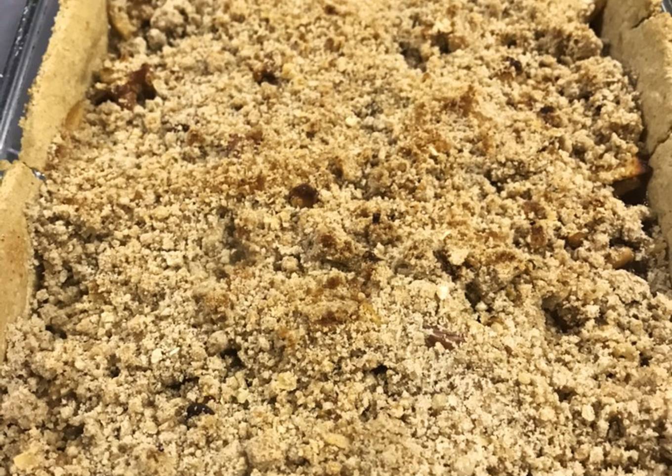 - Luego añades el relleno con jueguito y por sobre todo el crumble. Con el horno precalentado en 170 grados pones la budinera por unos 40 o 50 minutos aprox puedes revisar que el crumble se dore y la manzana quede blandita y listo!