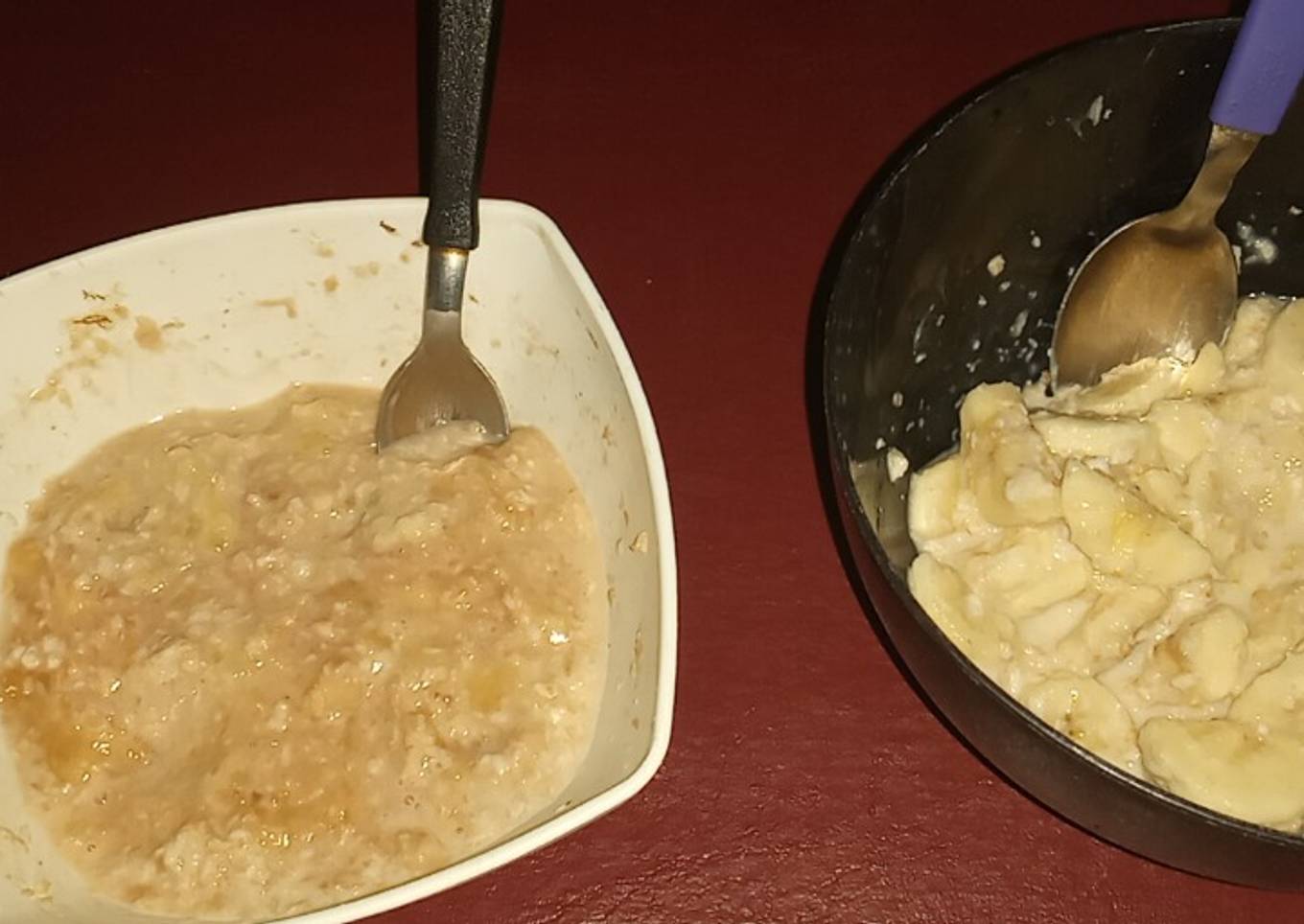 - En dos recipiente preparamos la misma cantidad. 8 cdas de agua hirviendo y luego le agregamos 4 cdas avena. Debe humedecerse toda, en cuestión de segundos se cocerá y esperará. Enseguida agregamos 3 cdas de leche (para la bebe use nutrilon su leche especial y para la más grande descremado) luego una cucharada de coco es opcional y por último la banana (para la bebe se la pise y a la más grande se la corte en rodajas...