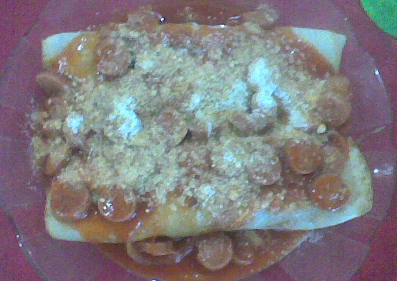 - Colocar algo de salsa, en el fondo de una asadera. Ubicar los canelones. Poner salsa encima. Ponerle papel de aluminio y hornear 10 minutos a 180 grados. Luego sacar el papel cubrir con queso rallado y gratinar 5 minutos a 200 grados.