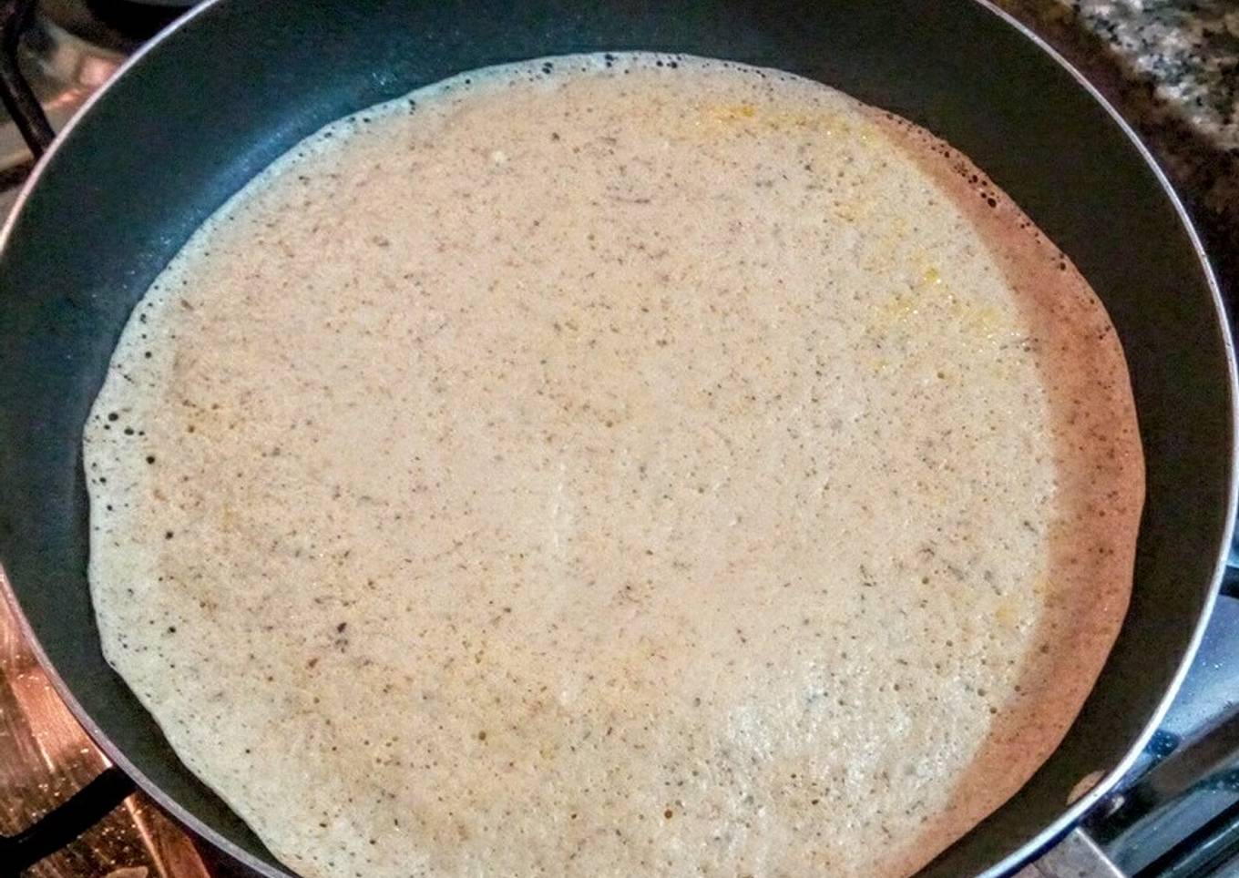 - Añadir los huevos, la harina de avena, el cremosino, la esencia y licuar hasta integrar bien los ingredientes. Poner el sartén al fuego, barnizado con mantequilla y volcar porciones de mezcla, mover el sartén para que se impregne todo el fondo del mismo y dorar por ambas caras. Se le da la vuelta a la crepa, cuando comienzan a salir burbujas en la superficie. Así con todas hasta terminar.