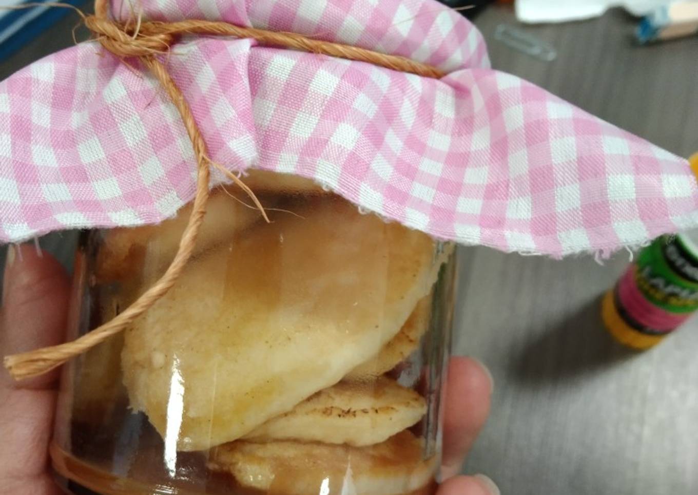 - Prepara los hot cakes cómo de costumbre, solo que pondrás porciones muy pequeñitas en el sartén para hacer botones. Una vez listos mételos al frasco, agrega la cajeta o miel y listo.